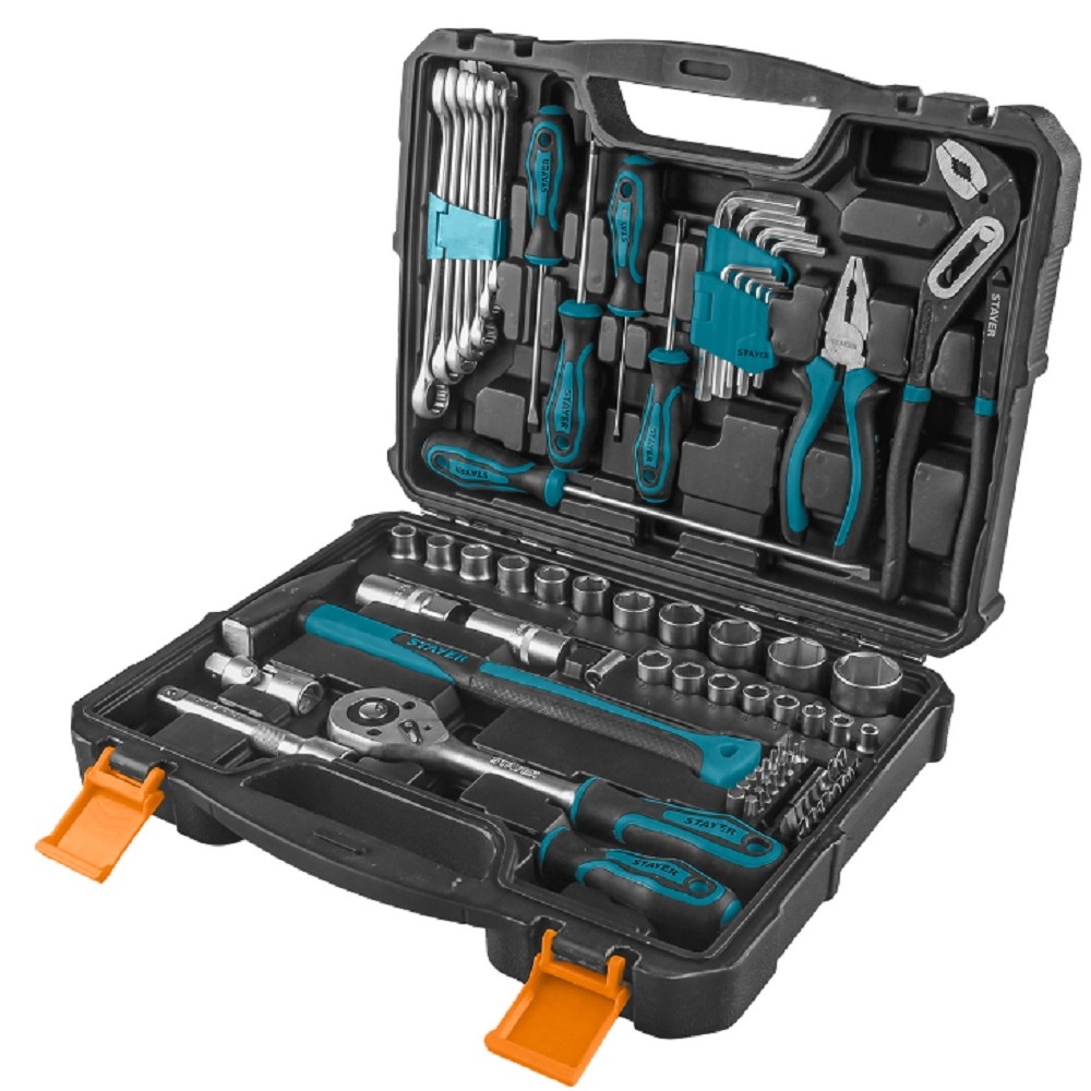 Головки 1/2" 11 шт ,Головки 1/4" 8 шт ,Головка торцевая свечная, 1/2" 2 шт ,Шарнир карданный 1/2 1 шт ,Удлинитель 1/2":125 мм 1 шт ,Рукоятка с трещеткой квадрат 1/2 1 шт ,Ключ комбинированный 7 шт ,Ключ шестигранный 9 шт ,Плоскогубцы 160мм 1 шт ,Ключ разводной 1 шт ,Отвертка 5 шт ,Молоток 1 шт ,Переходник для торцевых головок 1 шт ,Биты 1/4 33 шт ,Отвертка для бит 1 шт